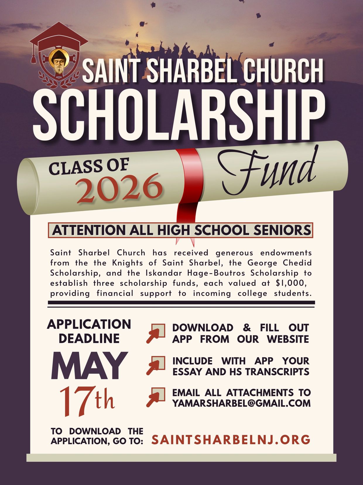 Saint Sharbel Church has received generous endowments from the the Knights of Saint Sharbel, the George Chedid Scholarship, and the Iskandar Hage-Boutros Scholarship to establish three scholarship funds, each valued at $1,000, providing financial support to incoming college students.