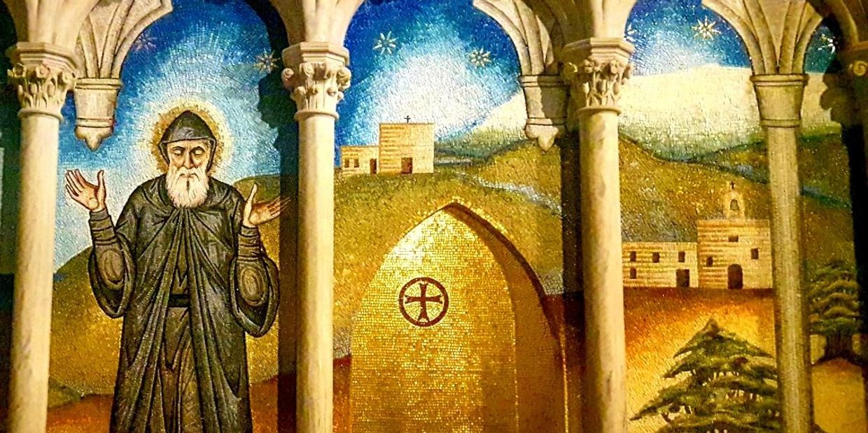 The artistic mosaic sanctuary depicts Saint Sharbel wrapped in a luminous halo in the Lebanese mountain, near the Saint Maron monastery in Annaya, Lebanon, where his tomb is located. Saint Sharbel is surrounded by flourishing cedars and crystalline waters of the Mediterranean, a symbol of spiritual life.